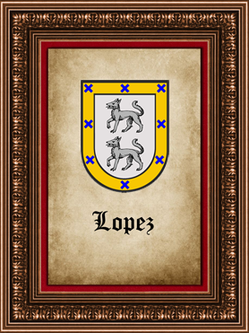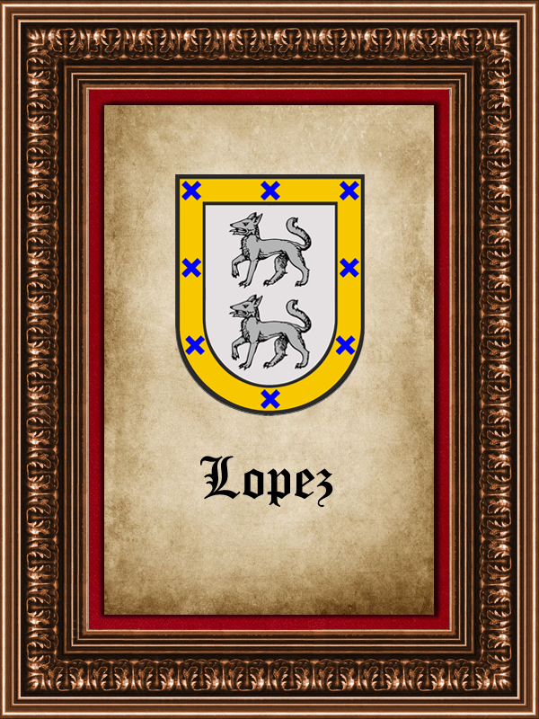 En campo de plata, dos lobos, de sable; bordura de oro, con ocho aspas, de azur |